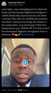 Oyebanji Akins, a popular critic and founder of CTDA Media, had just finished a studio session and was heading to check into a hotel he had booked in Houston, Marriott Bonvoy. The location wasn’t easy to find, so he called the front desk for help. When he did, he suspected that he was being stereotyped. On getting to the hotel, his suspicion was confirmed.